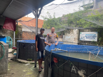 Polresta Sidoarjo | Bhabinkamtibmas Kedung Rejo Apresiasi Inovasi Budidaya Lele Bioflok Warganya